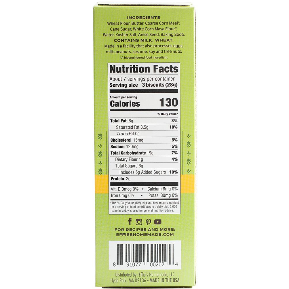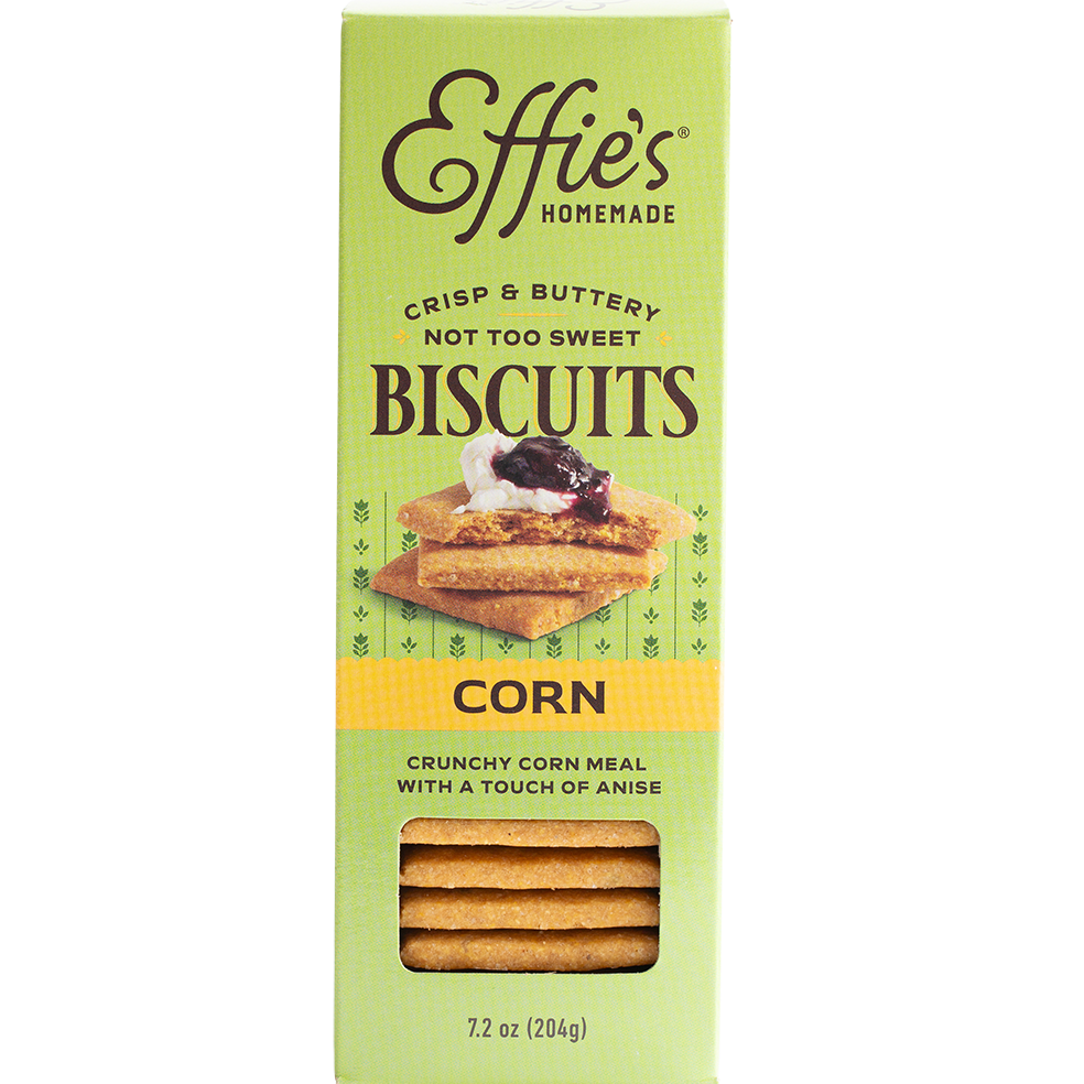Inspired by America's historic recipes for cornmeal flatbreads, Effie's Corn Biscuits are buttery and crunchy with an unexpected touch of anise. They pair wonderfully with creamy chèvre and red pepper jelly, or can be used creatively in recipes like a corn biscuit-crusted blueberry terrine.